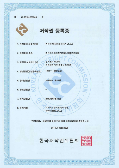 저작권 등록증: 영상화재 감지기 보유업체: (주)비젼인