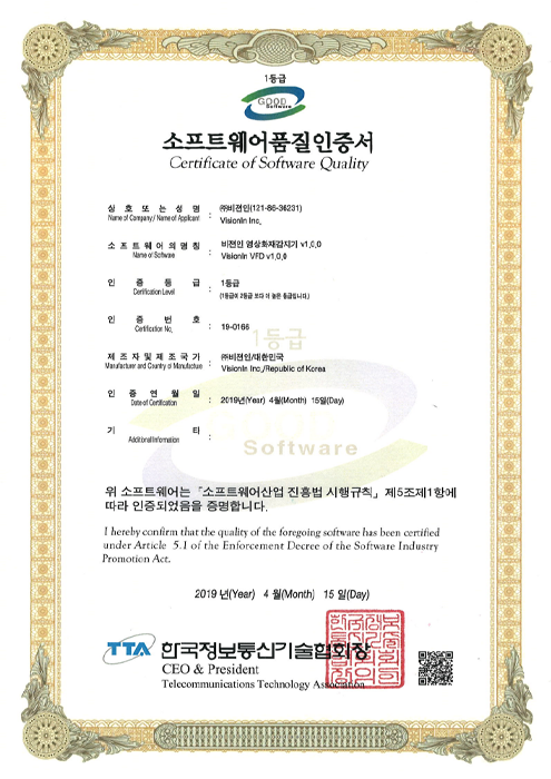 소프트웨어품질인증서: 영상화재감지기 보유업체: (주)비젼인