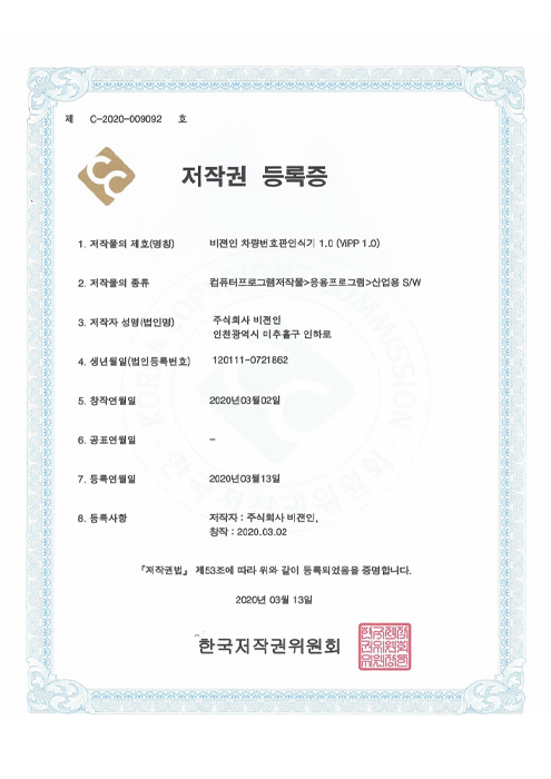 저작권 등록증: 차량번호판 인식기 보유업체: (주)비젼인