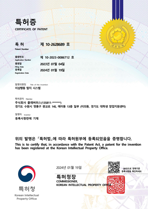 특허증: 이상행동 탐지 시스템 보유업체: 클레버러스(주)